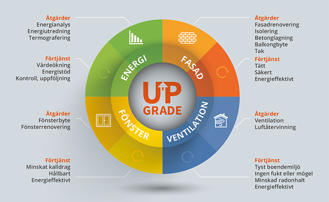 Konceptet "Upgrade" från Fasadgruppen är ett helhetsgrepp om fastighetsrenoveringar. Istället för att utföra enstaka åtgärder, erbjuder Fasadgruppen kompletta lösning UPGRADE som maximerar fastighetens värde och hållbarhet över tid.